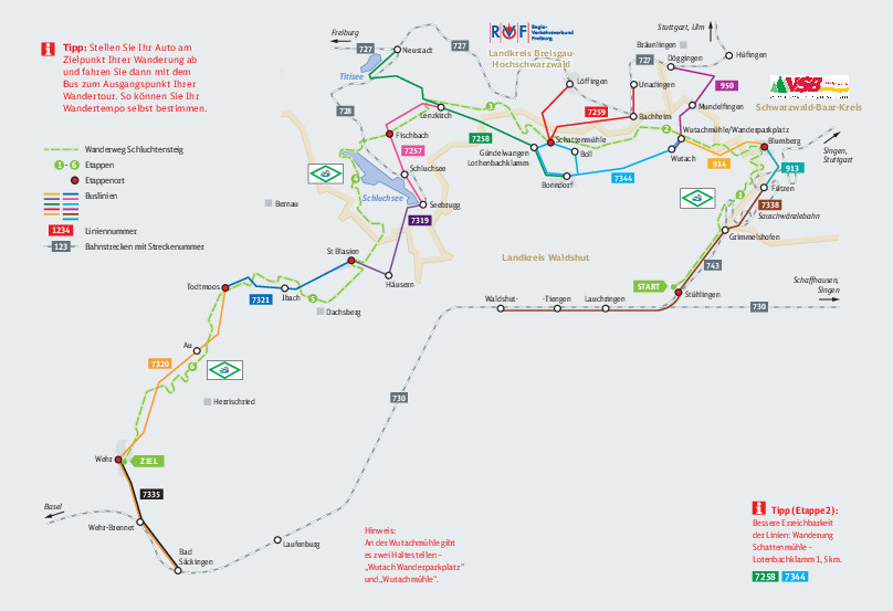 Tipp für Wanderer, die nur die ersten drei Etappen (Wutachflühen, Wutach- und Haslachschlucht) wandern möchten und anschließend mit dem Bus von Lenzkirch zurück zum Auto nach Stühlingen fahren: